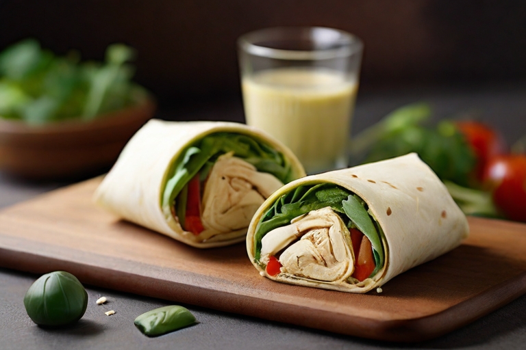 • Zubereitung: Hähnchenstreifen mit Hummus, Gemüse und Salat in einem Vollkorn-Wrap einrollen.